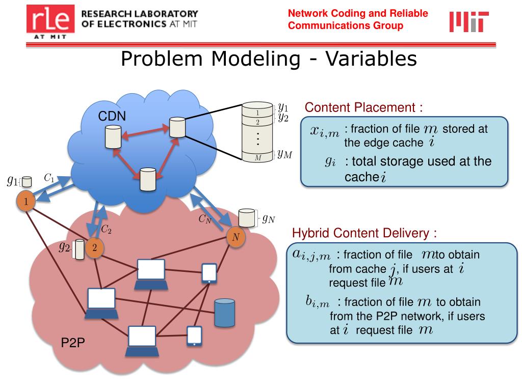 Problem Modeling - Variables Content Placement : : fraction of file stored at the edge cache CDN : total storage used at the cache Hybrid Content Delivery : : fraction of file to obtain from cache , if users at request file : fraction of file to obtain from the P2P network, if users at request file P2P