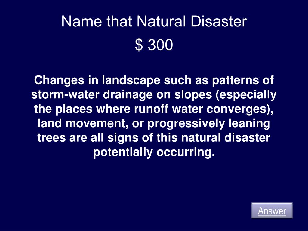 Name that Natural Disaster $ 300 Changes in landscape such as patterns of storm-water drainage on slopes (especially the places where runoff water converges), land movement, or progressively leaning trees are all signs of this natural disaster potentially occurring. Answer