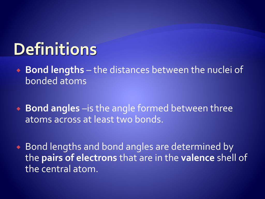 Definitions • Bond lengths – the distances between the nuclei of bonded atoms • Bond angles –is the angle formed between three atoms across at least two bonds. • Bond lengths and bond angles are determined by the pairs of electrons that are in the valence shell of the central atom.