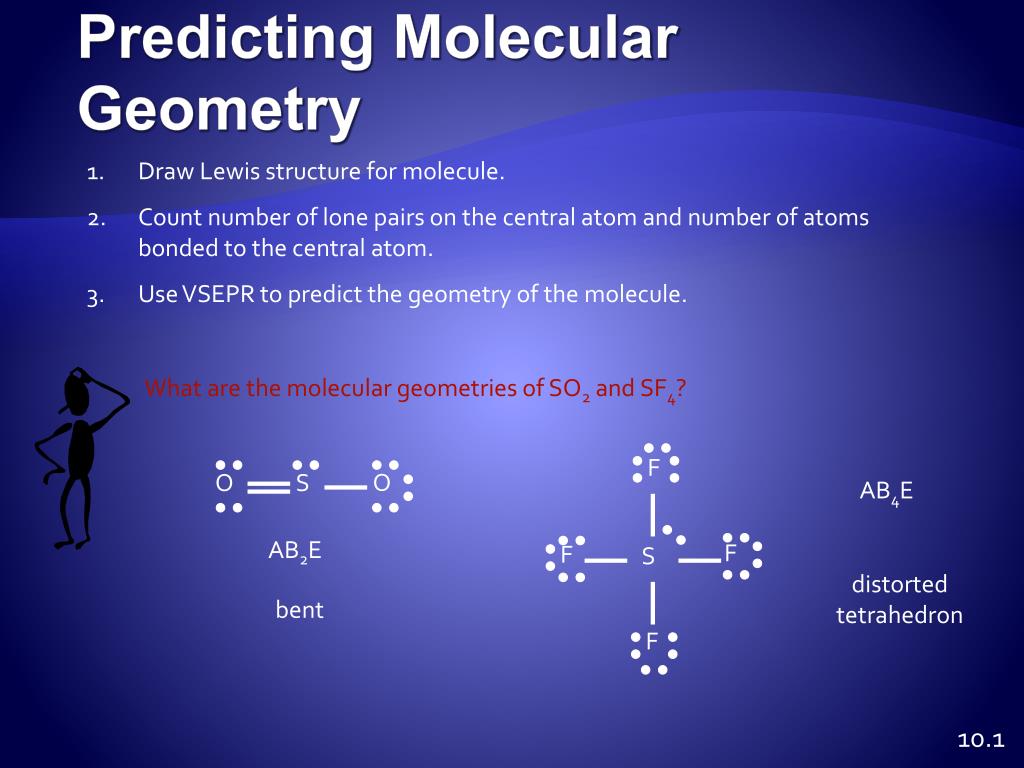 What are the molecular geometries of SO2 and SF4? F S F F O O S F Predicting Molecular Geometry • Draw Lewis structure for molecule. • Count number of lone pairs on the central atom and number of atoms bonded to the central atom. • Use VSEPR to predict the geometry of the molecule. AB4E AB2E distorted tetrahedron bent 10.1