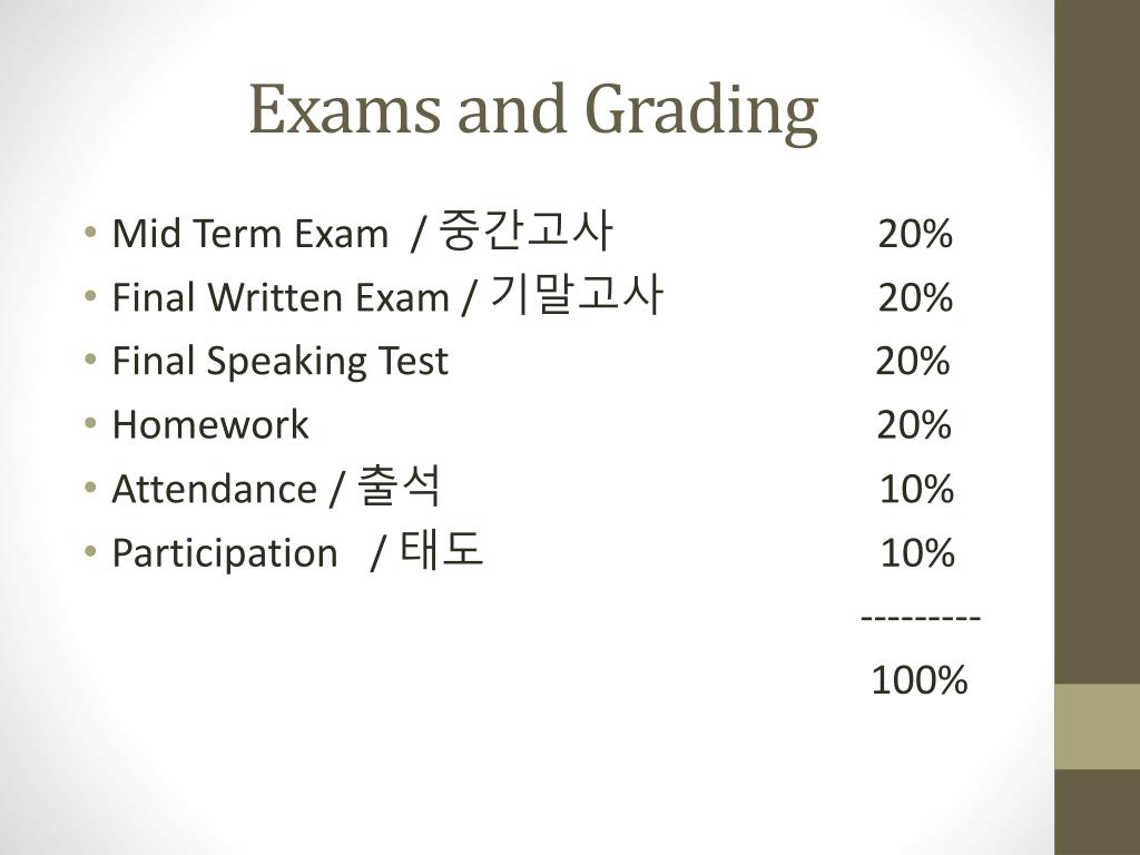 Exams and Grading • Mid Term Exam / 중간고사 20% • Final Written Exam / 기말고사 20% • Final Speaking Test 20% • Homework 20% • Attendance / 출석 10% • Participation / 태도 10% --------- 100%