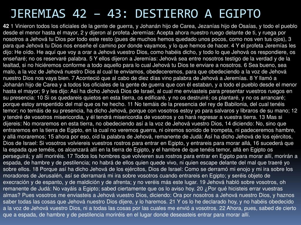 JEREMIAS 42 – 43: DESTIERRO A EGIPTO 42 1 Vinieron todos los oficiales de la gente de guerra, y Johanán hijo de Carea, Jezanías hijo de Osaías, y todo el pueblo desde el menor hasta el mayor, 2 y dijeron al profeta Jeremías: Acepta ahora nuestro ruego delante de ti, y ruega por nosotros a Jehová tu Dios por todo este resto (pues de muchos hemos quedado unos pocos, como nos ven tus ojos), 3 para que Jehová tu Dios nos enseñe el camino por donde vayamos, y lo que hemos de hacer. 4 Y el profeta Jeremías les dijo: He oído. He aquí que voy a orar a Jehová vuestro Dios, como habéis dicho, y todo lo que Jehová os respondiere, os enseñaré; no os reservaré palabra. 5 Y ellos dijeron a Jeremías: Jehová sea entre nosotros testigo de la verdad y de la lealtad, si no hiciéremos conforme a todo aquello para lo cual Jehová tu Dios te enviare a nosotros. 6 Sea bueno, sea malo, a la voz de Jehová nuestro Dios al cual te enviamos, obedeceremos, para que obedeciendo a la voz de Jehová nuestro Dios nos vaya bien. 7 Aconteció que al cabo de diez días vino palabra de Jehová a Jeremías. 8 Y llamó a Johanán hijo de Carea y a todos los oficiales de la gente de guerra que con él estaban, y a todo el pueblo desde el menor hasta el mayor; 9 y les dijo: Así ha dicho Jehová Dios de Israel, al cual me enviasteis para presentar vuestros ruegos en su presencia: 10 Si os quedareis quietos en esta tierra, os edificaré, y no os destruiré; os plantaré, y no os arrancaré; porque estoy arrepentido del mal que os he hecho. 11 No temáis de la presencia del rey de Babilonia, del cual tenéis temor; no temáis de su presencia, ha dicho Jehová, porque con vosotros estoy yo para salvaros y libraros de su mano; 12 y tendré de vosotros misericordia, y él tendrá misericordia de vosotros y os hará regresar a vuestra tierra. 13 Mas si dijereis: No moraremos en esta tierra, no obedeciendo así a la voz de Jehová vuestro Dios, 14 diciendo: No, sino que entraremos en la tierra de Egipto, en la cual no veremos guerra, ni oiremos sonido de trompeta, ni padeceremos hambre, y allá moraremos; 15 ahora por eso, oíd la palabra de Jehová, remanente de Judá: Así ha dicho Jehová de los ejércitos, Dios de Israel: Si vosotros volviereis vuestros rostros para entrar en Egipto, y entrareis para morar allá, 16 sucederá que la espada que teméis, os alcanzará allí en la tierra de Egipto, y el hambre de que tenéis temor, allá en Egipto os perseguirá; y allí moriréis. 17 Todos los hombres que volvieren sus rostros para entrar en Egipto para morar allí, morirán a espada, de hambre y de pestilencia; no habrá de ellos quien quede vivo, ni quien escape delante del mal que traeré yo sobre ellos. 18 Porque así ha dicho Jehová de los ejércitos, Dios de Israel: Como se derramó mi enojo y mi ira sobre los moradores de Jerusalén, así se derramará mi ira sobre vosotros cuando entrareis en Egipto; y seréis objeto de execración y de espanto, y de maldición y de afrenta; y no veréis más este lugar. 19 Jehová habló sobre vosotros, oh remanente de Judá: No vayáis a Egipto; sabed ciertamente que os lo aviso hoy. 20 ¿Por qué hicisteis errar vuestras almas? Pues vosotros me enviasteis a Jehová vuestro Dios, diciendo: Ora por nosotros a Jehová nuestro Dios, y haznos saber todas las cosas que Jehová nuestro Dios dijere, y lo haremos. 21 Y os lo he declarado hoy, y no habéis obedecido a la voz de Jehová vuestro Dios, ni a todas las cosas por las cuales me envió a vosotros. 22 Ahora, pues, sabed de cierto que a espada, de hambre y de pestilencia moriréis en el lugar donde deseasteis entrar para morar allí.
