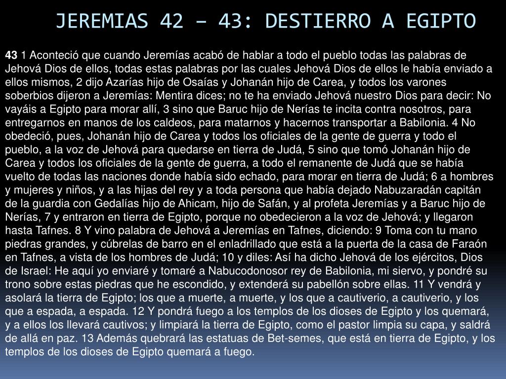 JEREMIAS 42 – 43: DESTIERRO A EGIPTO 43 1 Aconteció que cuando Jeremías acabó de hablar a todo el pueblo todas las palabras de Jehová Dios de ellos, todas estas palabras por las cuales Jehová Dios de ellos le había enviado a ellos mismos, 2 dijo Azarías hijo de Osaías y Johanán hijo de Carea, y todos los varones soberbios dijeron a Jeremías: Mentira dices; no te ha enviado Jehová nuestro Dios para decir: No vayáis a Egipto para morar allí, 3 sino que Baruc hijo de Nerías te incita contra nosotros, para entregarnos en manos de los caldeos, para matarnos y hacernos transportar a Babilonia. 4 No obedeció, pues, Johanán hijo de Carea y todos los oficiales de la gente de guerra y todo el pueblo, a la voz de Jehová para quedarse en tierra de Judá, 5 sino que tomó Johanán hijo de Carea y todos los oficiales de la gente de guerra, a todo el remanente de Judá que se había vuelto de todas las naciones donde había sido echado, para morar en tierra de Judá; 6 a hombres y mujeres y niños, y a las hijas del rey y a toda persona que había dejado Nabuzaradán capitán de la guardia con Gedalías hijo de Ahicam, hijo de Safán, y al profeta Jeremías y a Baruc hijo de Nerías, 7 y entraron en tierra de Egipto, porque no obedecieron a la voz de Jehová; y llegaron hasta Tafnes. 8 Y vino palabra de Jehová a Jeremías en Tafnes, diciendo: 9 Toma con tu mano piedras grandes, y cúbrelas de barro en el enladrillado que está a la puerta de la casa de Faraón en Tafnes, a vista de los hombres de Judá; 10 y diles: Así ha dicho Jehová de los ejércitos, Dios de Israel: He aquí yo enviaré y tomaré a Nabucodonosor rey de Babilonia, mi siervo, y pondré su trono sobre estas piedras que he escondido, y extenderá su pabellón sobre ellas. 11 Y vendrá y asolará la tierra de Egipto; los que a muerte, a muerte, y los que a cautiverio, a cautiverio, y los que a espada, a espada. 12 Y pondrá fuego a los templos de los dioses de Egipto y los quemará, y a ellos los llevará cautivos; y limpiará la tierra de Egipto, como el pastor limpia su capa, y saldrá de allá en paz. 13 Además quebrará las estatuas de Bet-semes, que está en tierra de Egipto, y los templos de los dioses de Egipto quemará a fuego.