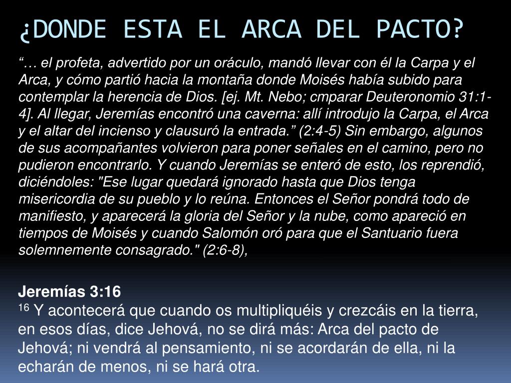 ¿DONDE ESTA EL ARCA DEL PACTO? “… el profeta, advertido por un oráculo, mandó llevar con él la Carpa y el Arca, y cómo partió hacia la montaña donde Moisés había subido para contemplar la herencia de Dios. [ej. Mt. Nebo; cmparar Deuteronomio 31:1-4]. Al llegar, Jeremías encontró una caverna: allí introdujo la Carpa, el Arca y el altar del incienso y clausuró la entrada.” (2:4-5) Sin embargo, algunos de sus acompañantes volvieron para poner señales en el camino, pero no pudieron encontrarlo. Y cuando Jeremías se enteró de esto, los reprendió, diciéndoles: "Ese lugar quedará ignorado hasta que Dios tenga misericordia de su pueblo y lo reúna. Entonces el Señor pondrá todo de manifiesto, y aparecerá la gloria del Señor y la nube, como apareció en tiempos de Moisés y cuando Salomón oró para que el Santuario fuera solemnemente consagrado." (2:6-8), Jeremías 3:16 16 Y acontecerá que cuando os multipliquéis y crezcáis en la tierra, en esos días, dice Jehová, no se dirá más: Arca del pacto de Jehová; ni vendrá al pensamiento, ni se acordarán de ella, ni la echarán de menos, ni se hará otra.