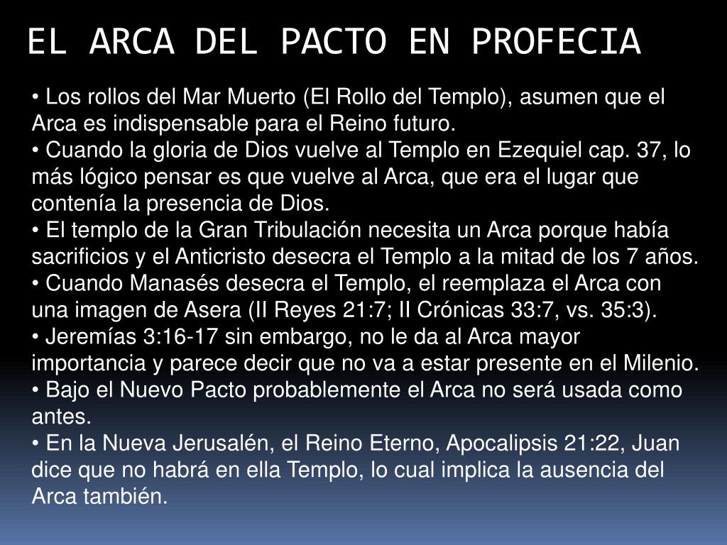 EL ARCA DEL PACTO EN PROFECIA • Los rollos del Mar Muerto (El Rollo del Templo), asumen que el Arca es indispensable para el Reino futuro. • Cuando la gloria de Dios vuelve al Templo en Ezequiel cap. 37, lo más lógico pensar es que vuelve al Arca, que era el lugar que contenía la presencia de Dios. • El templo de la Gran Tribulación necesita un Arca porque había sacrificios y el Anticristo desecra el Templo a la mitad de los 7 años. • Cuando Manasés desecra el Templo, el reemplaza el Arca con una imagen de Asera (II Reyes 21:7; II Crónicas 33:7, vs. 35:3). • Jeremías 3:16-17 sin embargo, no le da al Arca mayor importancia y parece decir que no va a estar presente en el Milenio. • Bajo el Nuevo Pacto probablemente el Arca no será usada como antes. • En la Nueva Jerusalén, el Reino Eterno, Apocalipsis 21:22, Juan dice que no habrá en ella Templo, lo cual implica la ausencia del Arca también.