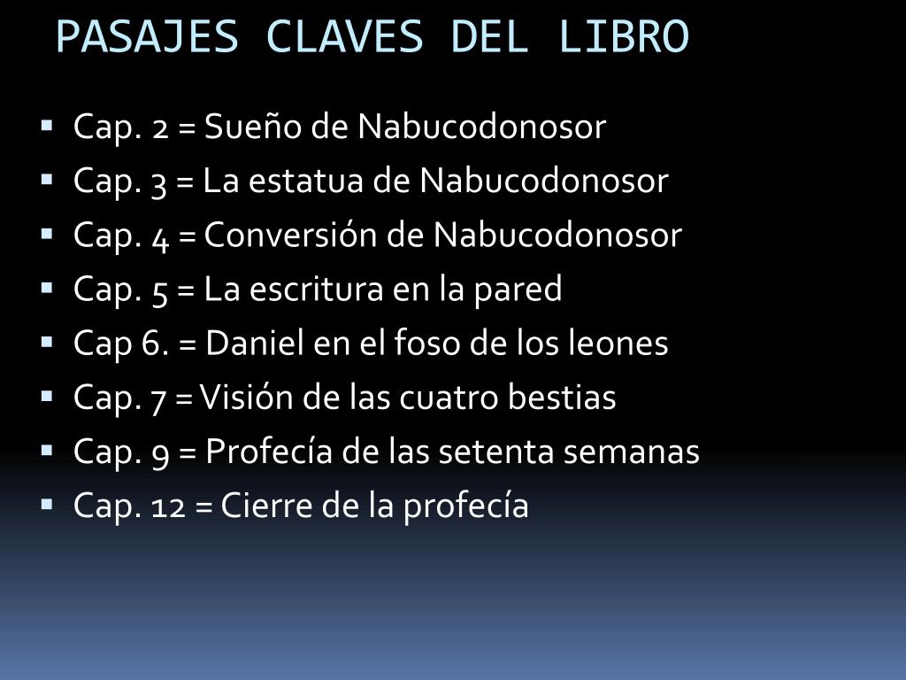 PASAJES CLAVES DEL LIBRO • Cap. 2 = Sueño de Nabucodonosor • Cap. 3 = La estatua de Nabucodonosor • Cap. 4 = Conversión de Nabucodonosor • Cap. 5 = La escritura en la pared • Cap 6. = Daniel en el foso de los leones • Cap. 7 = Visión de las cuatro bestias • Cap. 9 = Profecía de las setenta semanas • Cap. 12 = Cierre de la profecía