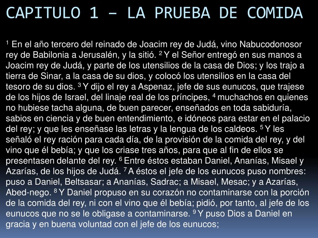 CAPITULO 1 – LA PRUEBA DE COMIDA 1 En el año tercero del reinado de Joacim rey de Judá, vino Nabucodonosor rey de Babilonia a Jerusalén, y la sitió. 2 Y el Señor entregó en sus manos a Joacim rey de Judá, y parte de los utensilios de la casa de Dios; y los trajo a tierra de Sinar, a la casa de su dios, y colocó los utensilios en la casa del tesoro de su dios. 3 Y dijo el rey a Aspenaz, jefe de sus eunucos, que trajese de los hijos de Israel, del linaje real de los príncipes, 4 muchachos en quienes no hubiese tacha alguna, de buen parecer, enseñados en toda sabiduría, sabios en ciencia y de buen entendimiento, e idóneos para estar en el palacio del rey; y que les enseñase las letras y la lengua de los caldeos. 5 Y les señaló el rey ración para cada día, de la provisión de la comida del rey, y del vino que él bebía; y que los criase tres años, para que al fin de ellos se presentasen delante del rey. 6 Entre éstos estaban Daniel, Ananías, Misael y Azarías, de los hijos de Judá. 7 A éstos el jefe de los eunucos puso nombres: puso a Daniel, Beltsasar; a Ananías, Sadrac; a Misael, Mesac; y a Azarías, Abed-nego. 8 Y Daniel propuso en su corazón no contaminarse con la porción de la comida del rey, ni con el vino que él bebía; pidió, por tanto, al jefe de los eunucos que no se le obligase a contaminarse. 9 Y puso Dios a Daniel en gracia y en buena voluntad con el jefe de los eunucos;