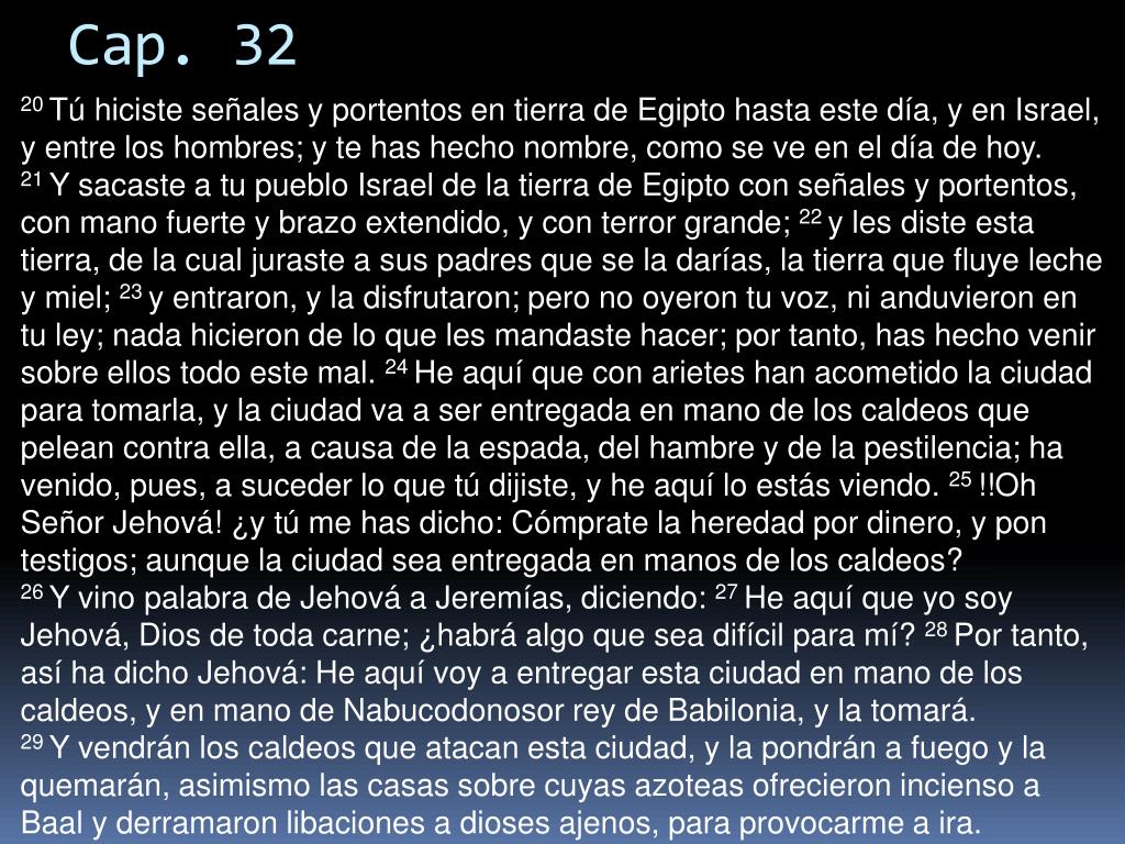 Cap. 32 20 Tú hiciste señales y portentos en tierra de Egipto hasta este día, y en Israel, y entre los hombres; y te has hecho nombre, como se ve en el día de hoy. 21 Y sacaste a tu pueblo Israel de la tierra de Egipto con señales y portentos, con mano fuerte y brazo extendido, y con terror grande; 22 y les diste esta tierra, de la cual juraste a sus padres que se la darías, la tierra que fluye leche y miel; 23 y entraron, y la disfrutaron; pero no oyeron tu voz, ni anduvieron en tu ley; nada hicieron de lo que les mandaste hacer; por tanto, has hecho venir sobre ellos todo este mal. 24 He aquí que con arietes han acometido la ciudad para tomarla, y la ciudad va a ser entregada en mano de los caldeos que pelean contra ella, a causa de la espada, del hambre y de la pestilencia; ha venido, pues, a suceder lo que tú dijiste, y he aquí lo estás viendo. 25 !!Oh Señor Jehová! ¿y tú me has dicho: Cómprate la heredad por dinero, y pon testigos; aunque la ciudad sea entregada en manos de los caldeos? 26 Y vino palabra de Jehová a Jeremías, diciendo: 27 He aquí que yo soy Jehová, Dios de toda carne; ¿habrá algo que sea difícil para mí? 28 Por tanto, así ha dicho Jehová: He aquí voy a entregar esta ciudad en mano de los caldeos, y en mano de Nabucodonosor rey de Babilonia, y la tomará. 29 Y vendrán los caldeos que atacan esta ciudad, y la pondrán a fuego y la quemarán, asimismo las casas sobre cuyas azoteas ofrecieron incienso a Baal y derramaron libaciones a dioses ajenos, para provocarme a ira.