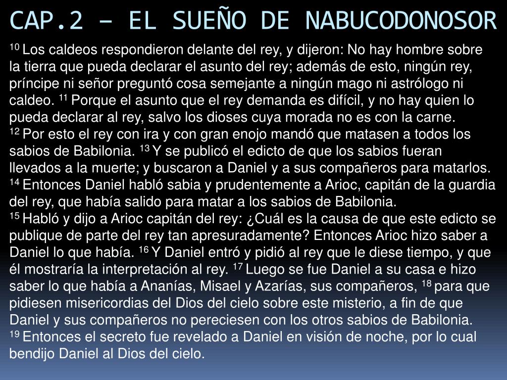 CAP.2 – EL SUEÑO DE NABUCODONOSOR 10 Los caldeos respondieron delante del rey, y dijeron: No hay hombre sobre la tierra que pueda declarar el asunto del rey; además de esto, ningún rey, príncipe ni señor preguntó cosa semejante a ningún mago ni astrólogo ni caldeo. 11 Porque el asunto que el rey demanda es difícil, y no hay quien lo pueda declarar al rey, salvo los dioses cuya morada no es con la carne. 12 Por esto el rey con ira y con gran enojo mandó que matasen a todos los sabios de Babilonia. 13 Y se publicó el edicto de que los sabios fueran llevados a la muerte; y buscaron a Daniel y a sus compañeros para matarlos. 14 Entonces Daniel habló sabia y prudentemente a Arioc, capitán de la guardia del rey, que había salido para matar a los sabios de Babilonia. 15 Habló y dijo a Arioc capitán del rey: ¿Cuál es la causa de que este edicto se publique de parte del rey tan apresuradamente? Entonces Arioc hizo saber a Daniel lo que había. 16 Y Daniel entró y pidió al rey que le diese tiempo, y que él mostraría la interpretación al rey. 17 Luego se fue Daniel a su casa e hizo saber lo que había a Ananías, Misael y Azarías, sus compañeros, 18 para que pidiesen misericordias del Dios del cielo sobre este misterio, a fin de que Daniel y sus compañeros no pereciesen con los otros sabios de Babilonia. 19 Entonces el secreto fue revelado a Daniel en visión de noche, por lo cual bendijo Daniel al Dios del cielo.