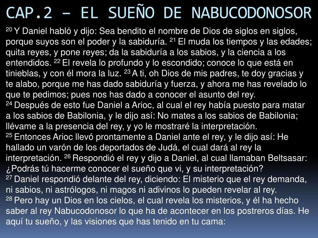 CAP.2 – EL SUEÑO DE NABUCODONOSOR 20 Y Daniel habló y dijo: Sea bendito el nombre de Dios de siglos en siglos, porque suyos son el poder y la sabiduría. 21 El muda los tiempos y las edades; quita reyes, y pone reyes; da la sabiduría a los sabios, y la ciencia a los entendidos. 22 El revela lo profundo y lo escondido; conoce lo que está en tinieblas, y con él mora la luz. 23 A ti, oh Dios de mis padres, te doy gracias y te alabo, porque me has dado sabiduría y fuerza, y ahora me has revelado lo que te pedimos; pues nos has dado a conocer el asunto del rey. 24 Después de esto fue Daniel a Arioc, al cual el rey había puesto para matar a los sabios de Babilonia, y le dijo así: No mates a los sabios de Babilonia; llévame a la presencia del rey, y yo le mostraré la interpretación. 25 Entonces Arioc llevó prontamente a Daniel ante el rey, y le dijo así: He hallado un varón de los deportados de Judá, el cual dará al rey la interpretación. 26 Respondió el rey y dijo a Daniel, al cual llamaban Beltsasar: ¿Podrás tú hacerme conocer el sueño que vi, y su interpretación? 27 Daniel respondió delante del rey, diciendo: El misterio que el rey demanda, ni sabios, ni astrólogos, ni magos ni adivinos lo pueden revelar al rey. 28 Pero hay un Dios en los cielos, el cual revela los misterios, y él ha hecho saber al rey Nabucodonosor lo que ha de acontecer en los postreros días. He aquí tu sueño, y las visiones que has tenido en tu cama: