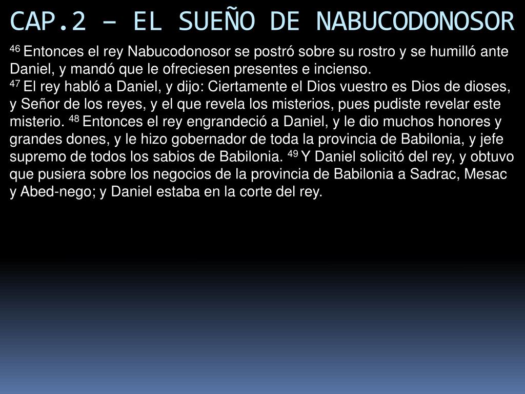 CAP.2 – EL SUEÑO DE NABUCODONOSOR 46 Entonces el rey Nabucodonosor se postró sobre su rostro y se humilló ante Daniel, y mandó que le ofreciesen presentes e incienso. 47 El rey habló a Daniel, y dijo: Ciertamente el Dios vuestro es Dios de dioses, y Señor de los reyes, y el que revela los misterios, pues pudiste revelar este misterio. 48 Entonces el rey engrandeció a Daniel, y le dio muchos honores y grandes dones, y le hizo gobernador de toda la provincia de Babilonia, y jefe supremo de todos los sabios de Babilonia. 49 Y Daniel solicitó del rey, y obtuvo que pusiera sobre los negocios de la provincia de Babilonia a Sadrac, Mesac y Abed-nego; y Daniel estaba en la corte del rey.