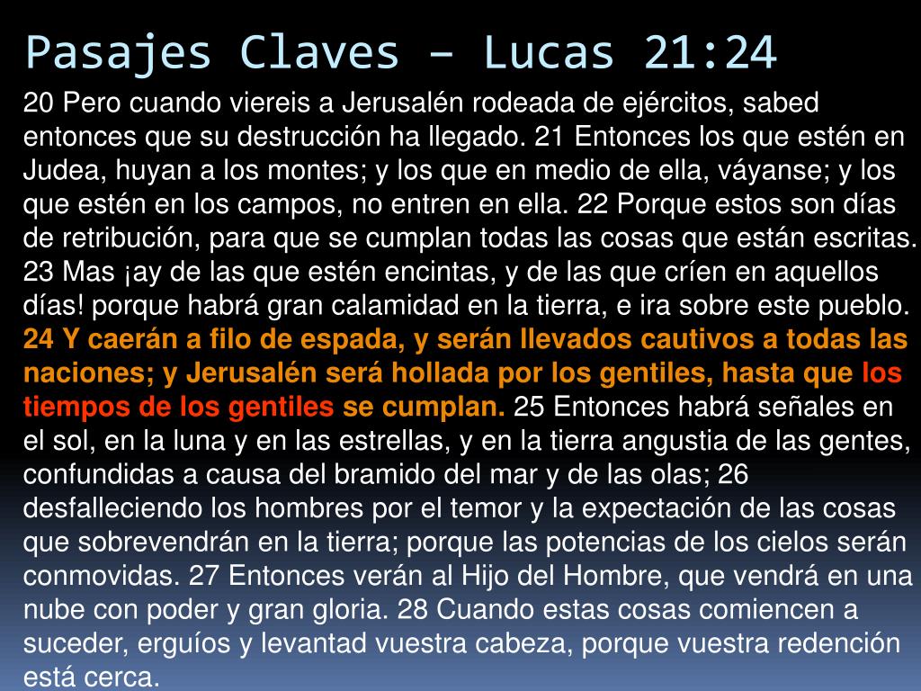 Pasajes Claves – Lucas 21:24 20 Pero cuando viereis a Jerusalén rodeada de ejércitos, sabed entonces que su destrucción ha llegado. 21 Entonces los que estén en Judea, huyan a los montes; y los que en medio de ella, váyanse; y los que estén en los campos, no entren en ella. 22 Porque estos son días de retribución, para que se cumplan todas las cosas que están escritas. 23 Mas ¡ay de las que estén encintas, y de las que críen en aquellos días! porque habrá gran calamidad en la tierra, e ira sobre este pueblo. 24 Y caerán a filo de espada, y serán llevados cautivos a todas las naciones; y Jerusalén será hollada por los gentiles, hasta que los tiempos de los gentiles se cumplan. 25 Entonces habrá señales en el sol, en la luna y en las estrellas, y en la tierra angustia de las gentes, confundidas a causa del bramido del mar y de las olas; 26 desfalleciendo los hombres por el temor y la expectación de las cosas que sobrevendrán en la tierra; porque las potencias de los cielos serán conmovidas. 27 Entonces verán al Hijo del Hombre, que vendrá en una nube con poder y gran gloria. 28 Cuando estas cosas comiencen a suceder, erguíos y levantad vuestra cabeza, porque vuestra redención está cerca.