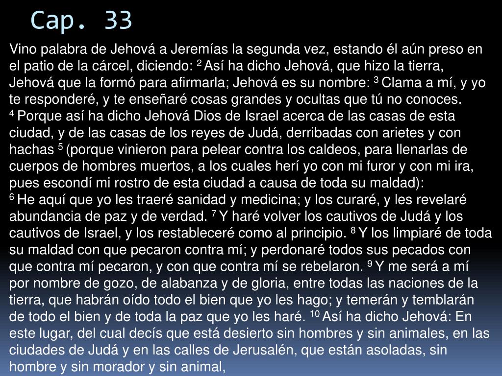 Cap. 33 Vino palabra de Jehová a Jeremías la segunda vez, estando él aún preso en el patio de la cárcel, diciendo: 2 Así ha dicho Jehová, que hizo la tierra, Jehová que la formó para afirmarla; Jehová es su nombre: 3 Clama a mí, y yo te responderé, y te enseñaré cosas grandes y ocultas que tú no conoces. 4 Porque así ha dicho Jehová Dios de Israel acerca de las casas de esta ciudad, y de las casas de los reyes de Judá, derribadas con arietes y con hachas 5 (porque vinieron para pelear contra los caldeos, para llenarlas de cuerpos de hombres muertos, a los cuales herí yo con mi furor y con mi ira, pues escondí mi rostro de esta ciudad a causa de toda su maldad): 6 He aquí que yo les traeré sanidad y medicina; y los curaré, y les revelaré abundancia de paz y de verdad. 7 Y haré volver los cautivos de Judá y los cautivos de Israel, y los restableceré como al principio. 8 Y los limpiaré de toda su maldad con que pecaron contra mí; y perdonaré todos sus pecados con que contra mí pecaron, y con que contra mí se rebelaron. 9 Y me será a mí por nombre de gozo, de alabanza y de gloria, entre todas las naciones de la tierra, que habrán oído todo el bien que yo les hago; y temerán y temblarán de todo el bien y de toda la paz que yo les haré. 10 Así ha dicho Jehová: En este lugar, del cual decís que está desierto sin hombres y sin animales, en las ciudades de Judá y en las calles de Jerusalén, que están asoladas, sin hombre y sin morador y sin animal,