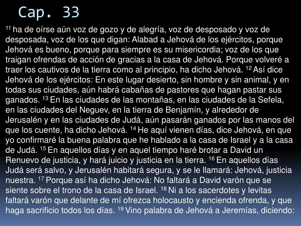 Cap. 33 11 ha de oírse aún voz de gozo y de alegría, voz de desposado y voz de desposada, voz de los que digan: Alabad a Jehová de los ejércitos, porque Jehová es bueno, porque para siempre es su misericordia; voz de los que traigan ofrendas de acción de gracias a la casa de Jehová. Porque volveré a traer los cautivos de la tierra como al principio, ha dicho Jehová. 12 Así dice Jehová de los ejércitos: En este lugar desierto, sin hombre y sin animal, y en todas sus ciudades, aún habrá cabañas de pastores que hagan pastar sus ganados. 13 En las ciudades de las montañas, en las ciudades de la Sefela, en las ciudades del Neguev, en la tierra de Benjamín, y alrededor de Jerusalén y en las ciudades de Judá, aún pasarán ganados por las manos del que los cuente, ha dicho Jehová. 14 He aquí vienen días, dice Jehová, en que yo confirmaré la buena palabra que he hablado a la casa de Israel y a la casa de Judá. 15 En aquellos días y en aquel tiempo haré brotar a David un Renuevo de justicia, y hará juicio y justicia en la tierra. 16 En aquellos días Judá será salvo, y Jerusalén habitará segura, y se le llamará: Jehová, justicia nuestra. 17 Porque así ha dicho Jehová: No faltará a David varón que se siente sobre el trono de la casa de Israel. 18 Ni a los sacerdotes y levitas faltará varón que delante de mí ofrezca holocausto y encienda ofrenda, y que haga sacrificio todos los días. 19 Vino palabra de Jehová a Jeremías, diciendo: