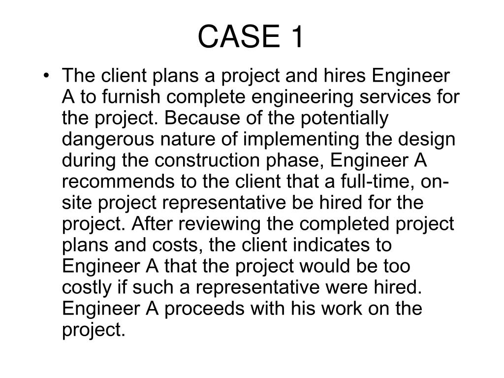 CASE 1 • The client plans a project and hires Engineer A to furnish complete engineering services for the project. Because of the potentially dangerous nature of implementing the design during the construction phase, Engineer A recommends to the client that a full-time, on-site project representative be hired for the project. After reviewing the completed project plans and costs, the client indicates to Engineer A that the project would be too costly if such a representative were hired. Engineer A proceeds with his work on the project.