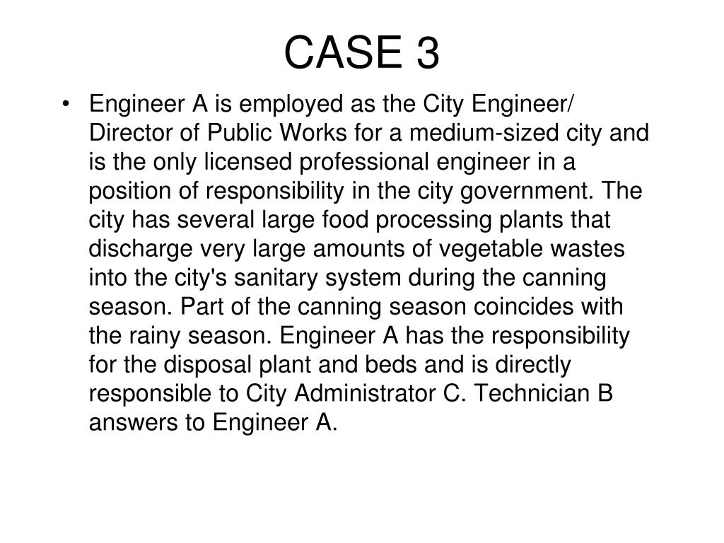 CASE 3 • Engineer A is employed as the City Engineer/ Director of Public Works for a medium-sized city and is the only licensed professional engineer in a position of responsibility in the city government. The city has several large food processing plants that discharge very large amounts of vegetable wastes into the city's sanitary system during the canning season. Part of the canning season coincides with the rainy season. Engineer A has the responsibility for the disposal plant and beds and is directly responsible to City Administrator C. Technician B answers to Engineer A.