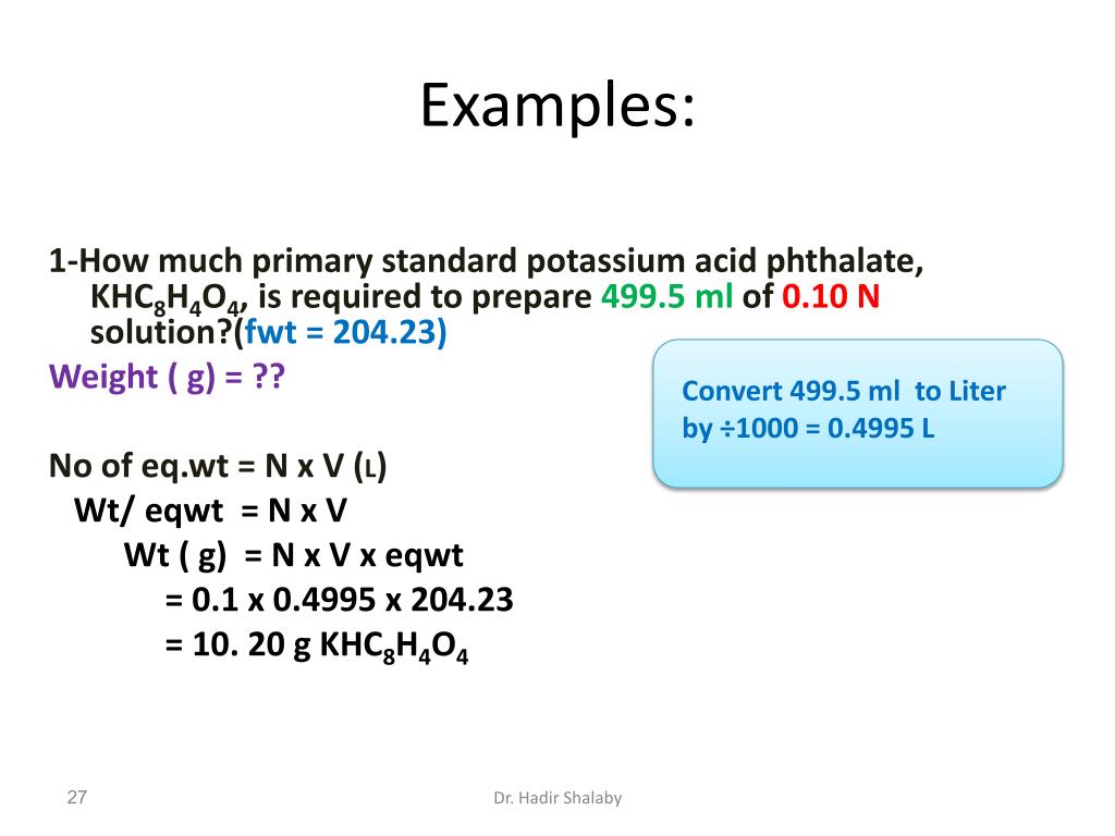 Examples: 1-How much primary standard potassium acid phthalate, KHC8H4O4, is required to prepare 499.5 ml of 0.10 N solution?(fwt = 204.23) Weight ( g) = ?? No of eq.wt = N x V (L) Wt/ eqwt= N x V Wt ( g) = N x V x eqwt = 0.1 x 0.4995 x 204.23 = 10. 20 g KHC8H4O4 Convert 499.5 ml to Liter by ÷1000 = 0.4995 L Dr. Hadir Shalaby