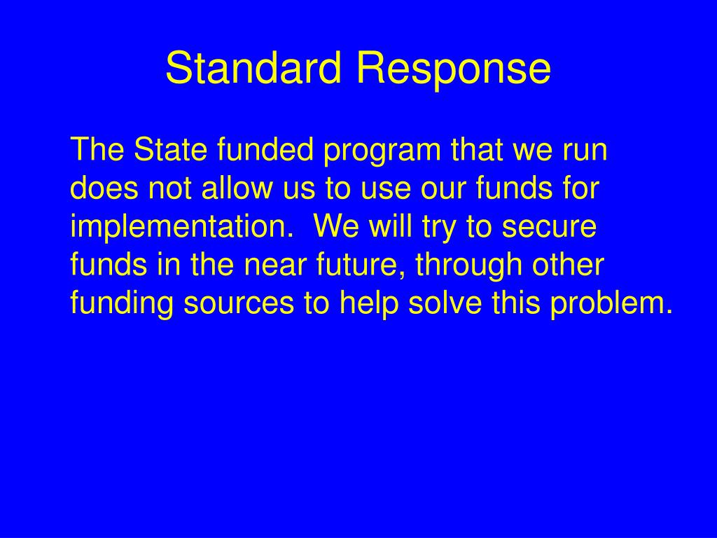 Standard Response The State funded program that we run does not allow us to use our funds for implementation. We will try to secure funds in the near future, through other funding sources to help solve this problem.