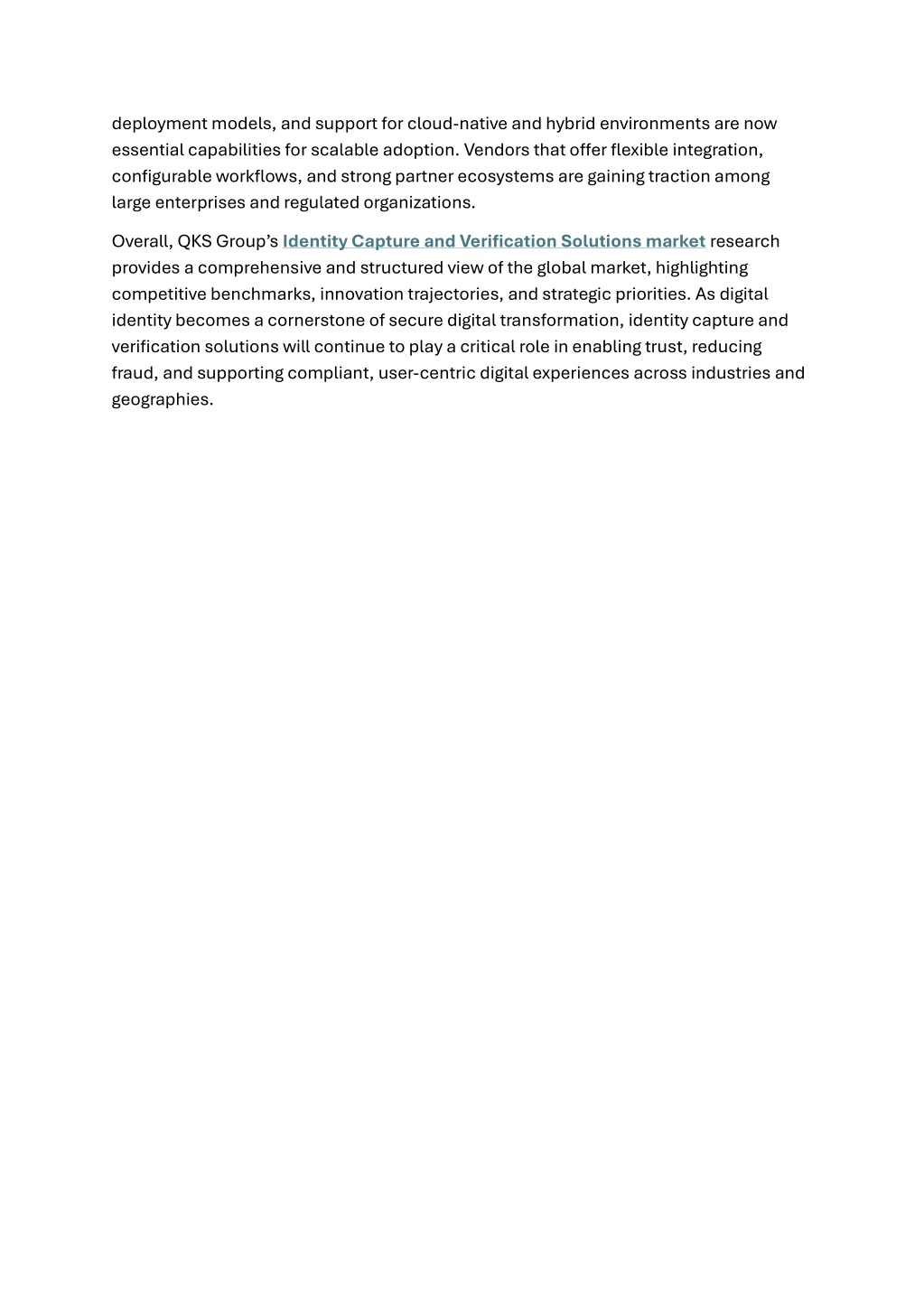 deployment models, and support for cloud-native and hybrid environments are now essential capabilities for scalable adoption. Vendors that offer flexible integration, configurable workflows, and strong partner ecosystems are gaining traction among large enterprises and regulated organizations. Overall, QKS Group’s Identity Capture and Verification Solutions market research provides a comprehensive and structured view of the global market, highlighting competitive benchmarks, innovation trajectories, and strategic priorities. As digital identity becomes a cornerstone of secure digital transformation, identity capture and verification solutions will continue to play a critical role in enabling trust, reducing fraud, and supporting compliant, user-centric digital experiences across industries and geographies.