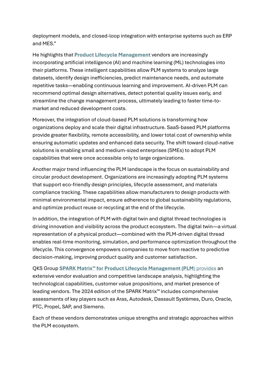 deployment models, and closed-loop integration with enterprise systems such as ERP and MES.” He highlights that Product Lifecycle Management vendors are increasingly incorporating artificial intelligence (AI) and machine learning (ML) technologies into their platforms. These intelligent capabilities allow PLM systems to analyze large datasets, identify design inefficiencies, predict maintenance needs, and automate repetitive tasks—enabling continuous learning and improvement. AI-driven PLM can recommend optimal design alternatives, detect potential quality issues early, and streamline the change management process, ultimately leading to faster time-to- market and reduced development costs. Moreover, the integration of cloud-based PLM solutions is transforming how organizations deploy and scale their digital infrastructure. SaaS-based PLM platforms provide greater flexibility, remote accessibility, and lower total cost of ownership while ensuring automatic updates and enhanced data security. The shift toward cloud-native solutions is enabling small and medium-sized enterprises (SMEs) to adopt PLM capabilities that were once accessible only to large organizations. Another major trend influencing the PLM landscape is the focus on sustainability and circular product development. Organizations are increasingly adopting PLM systems that support eco-friendly design principles, lifecycle assessment, and materials compliance tracking. These capabilities allow manufacturers to design products with minimal environmental impact, ensure adherence to global sustainability regulations, and optimize product reuse or recycling at the end of the lifecycle. In addition, the integration of PLM with digital twin and digital thread technologies is driving innovation and visibility across the product ecosystem. The digital twin—a virtual representation of a physical product—combined with the PLM-driven digital thread enables real-time monitoring, simulation, and performance optimization throughout the lifecycle. This convergence empowers companies to move from reactive to predictive decision-making, improving product quality and customer satisfaction. QKS Group SPARK Matrix™ for Product Lifecycle Management (PLM) provides an extensive vendor evaluation and competitive landscape analysis, highlighting the technological capabilities, customer value propositions, and market presence of leading vendors. The 2024 edition of the SPARK Matrix™ includes comprehensive assessments of key players such as Aras, Autodesk, Dassault Systèmes, Duro, Oracle, PTC, Propel, SAP, and Siemens. Each of these vendors demonstrates unique strengths and strategic approaches within the PLM ecosystem.