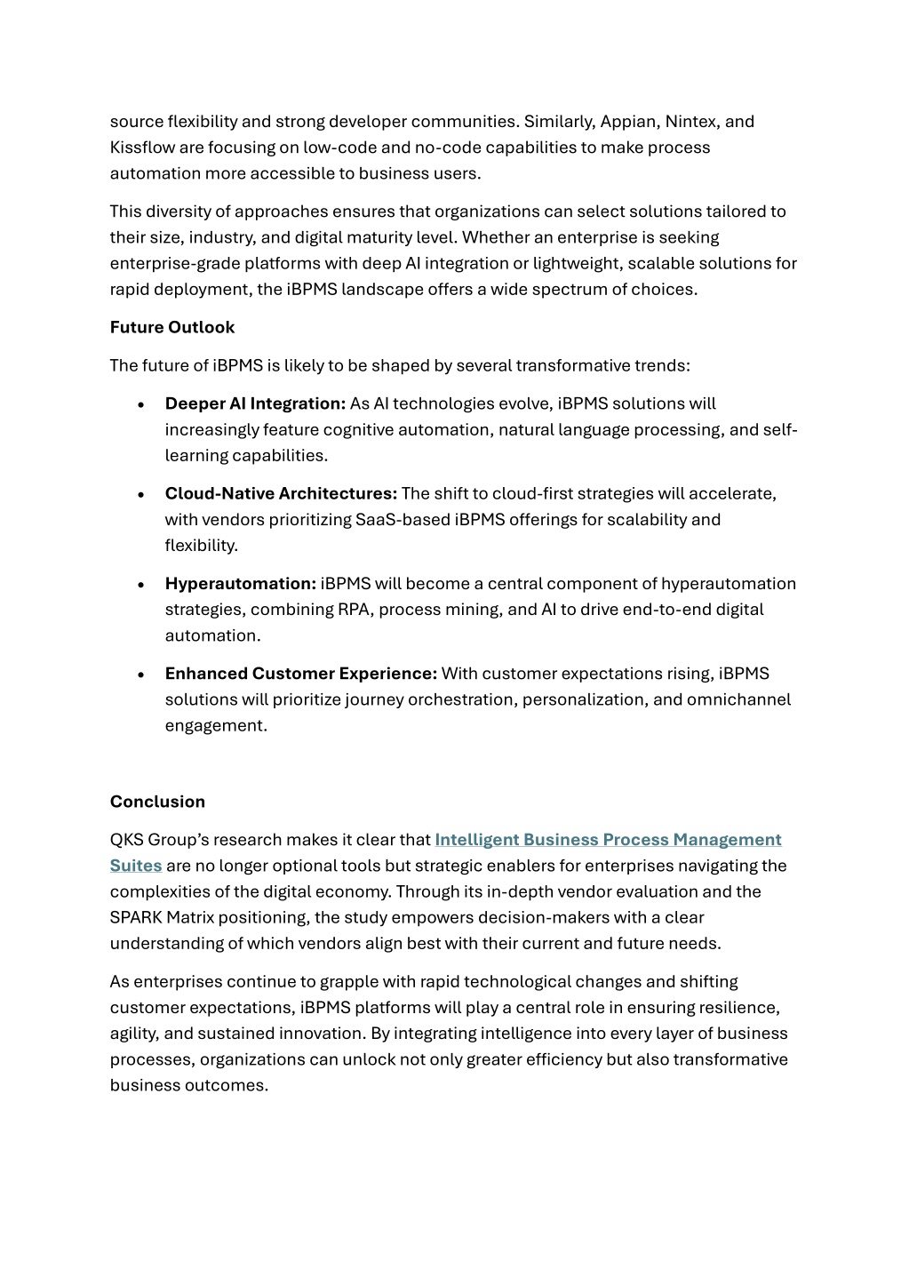 source flexibility and strong developer communities. Similarly, Appian, Nintex, and Kissflow are focusing on low-code and no-code capabilities to make process automation more accessible to business users. This diversity of approaches ensures that organizations can select solutions tailored to their size, industry, and digital maturity level. Whether an enterprise is seeking enterprise-grade platforms with deep AI integration or lightweight, scalable solutions for rapid deployment, the iBPMS landscape offers a wide spectrum of choices. Future Outlook The future of iBPMS is likely to be shaped by several transformative trends: •Deeper AI Integration: As AI technologies evolve, iBPMS solutions will increasingly feature cognitive automation, natural language processing, and self- learning capabilities. •Cloud-Native Architectures: The shift to cloud-first strategies will accelerate, with vendors prioritizing SaaS-based iBPMS offerings for scalability and flexibility. •Hyperautomation: iBPMS will become a central component of hyperautomation strategies, combining RPA, process mining, and AI to drive end-to-end digital automation. •Enhanced Customer Experience: With customer expectations rising, iBPMS solutions will prioritize journey orchestration, personalization, and omnichannel engagement. Conclusion QKS Group’s research makes it clear that Intelligent Business Process Management Suites are no longer optional tools but strategic enablers for enterprises navigating the complexities of the digital economy. Through its in-depth vendor evaluation and the SPARK Matrix positioning, the study empowers decision-makers with a clear understanding of which vendors align best with their current and future needs. As enterprises continue to grapple with rapid technological changes and shifting customer expectations, iBPMS platforms will play a central role in ensuring resilience, agility, and sustained innovation. By integrating intelligence into every layer of business processes, organizations can unlock not only greater efficiency but also transformative business outcomes.