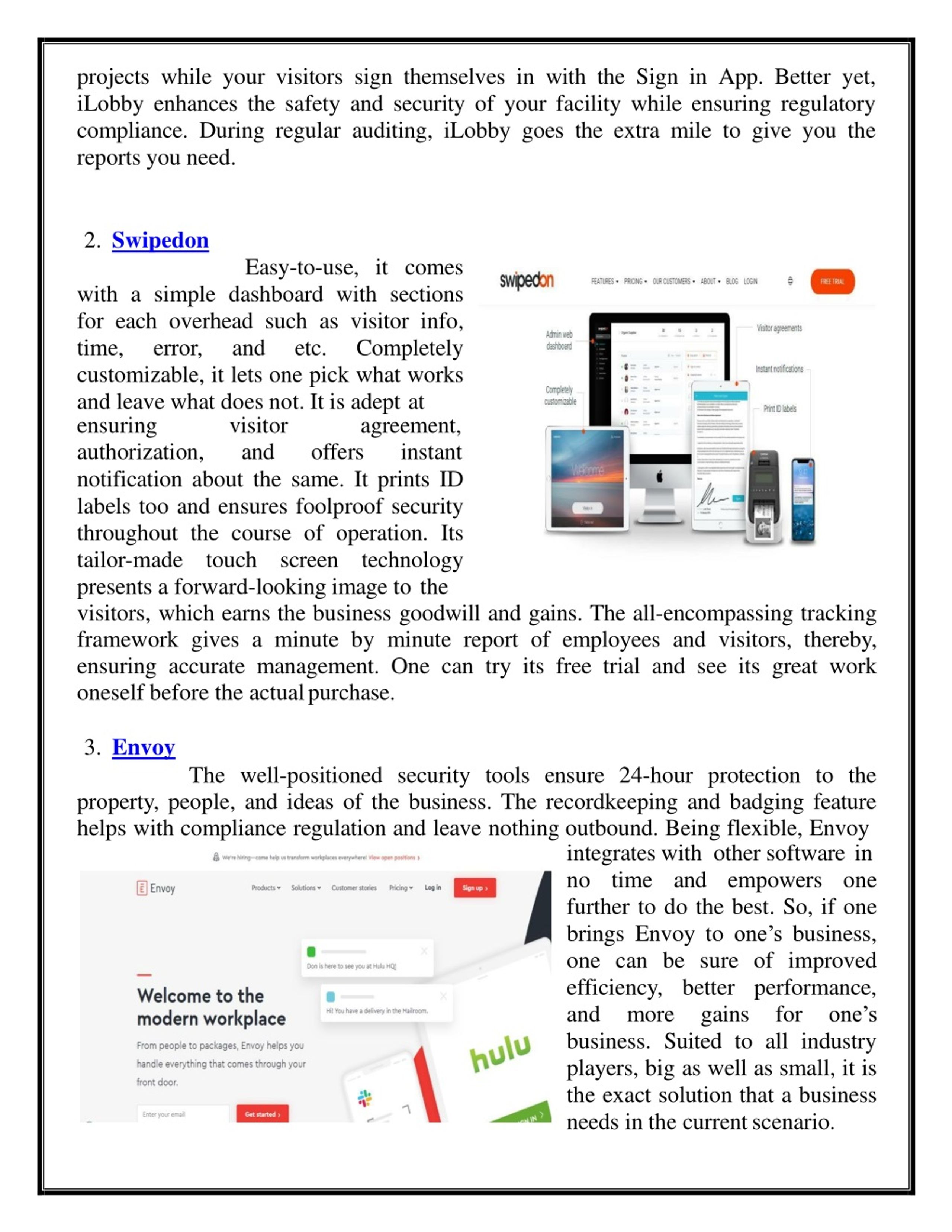 projects while your visitors sign themselves in with the Sign in App. Better yet, iLobby enhances the safety and security of your facility while ensuring regulatory compliance. During regular auditing, iLobby goes the extra mile to give you the reports you need. 2.Swipedon Easy-to-use, it comes with a simple dashboard with sections for each overhead such as visitor info, time, error, and etc. Completely customizable, it lets one pick what works and leave what does not. It is adeptat ensuring authorization, visitor agreement, andoffers instant notification about the same. It prints ID labels too and ensures foolproof security throughout the course of operation. Its tailor-made touch screen technology presents a forward-looking image tothe visitors, which earns the business goodwill and gains. The all-encompassing tracking framework gives a minute by minute report of employees and visitors, thereby, ensuring accurate management. One can try its free trial and see its great work oneself before the actualpurchase. 3.Envoy The well-positioned security tools ensure 24-hour protection to the property, people, and ideas of the business. The recordkeeping and badging feature helpswithcomplianceregulationandleavenothingoutbound.Beingflexible,Envoy integrates with other softwarein no time and empowers one further to do the best. So, if one brings Envoy to one’s business, one can be sure of improved efficiency, better performance, and more gains for one’s business. Suited to all industry players, big as well as small, it is the exact solution that a business needs in the currentscenario.