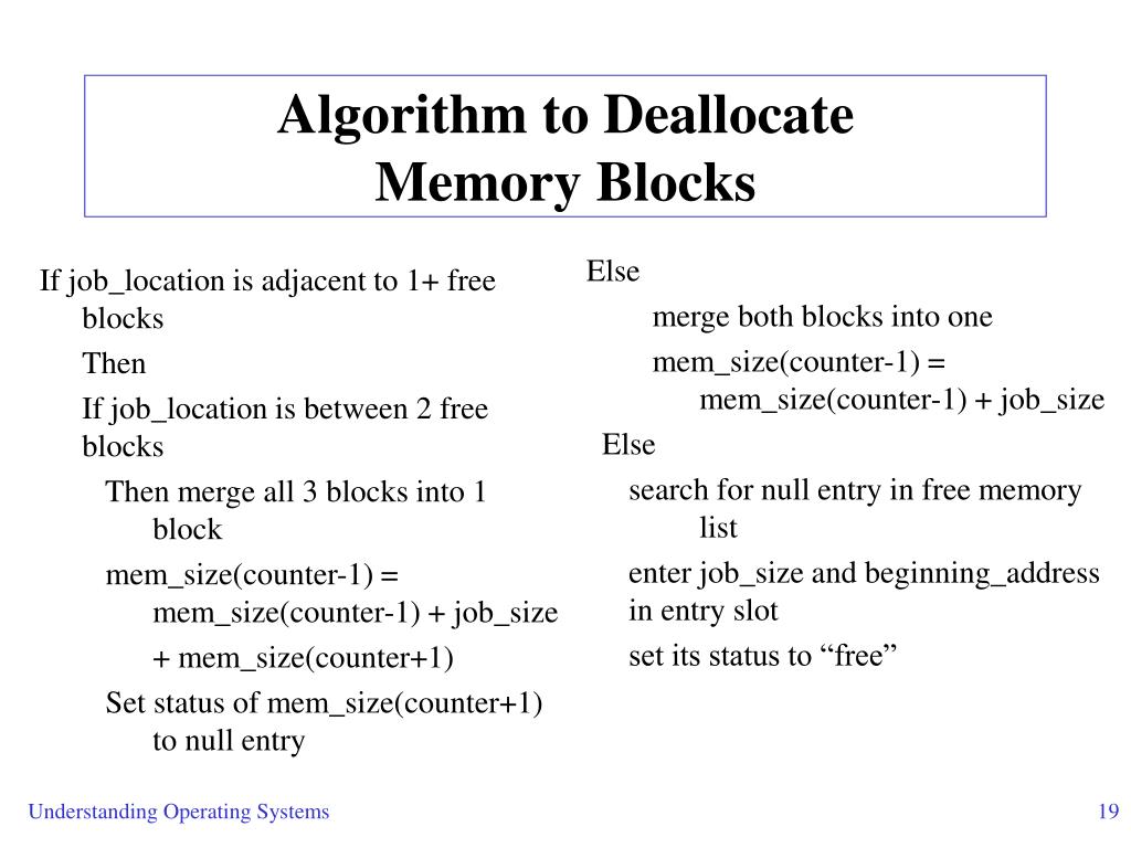 If job_location is adjacent to 1+ free blocks Then If job_location is between 2 free blocks Then merge all 3 blocks into 1 block mem_size(counter-1) = mem_size(counter-1) + job_size + mem_size(counter+1) Set status of mem_size(counter+1) to null entry Else merge both blocks into one mem_size(counter-1) = mem_size(counter-1) + job_size Else search for null entry in free memory list enter job_size and beginning_address in entry slot set its status to “free” Algorithm to Deallocate Memory Blocks Understanding Operating Systems