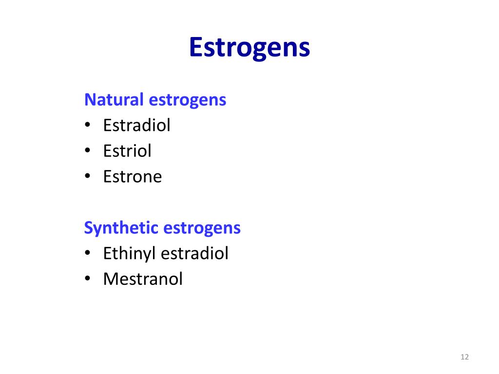 Estrogens Natural estrogens • Estradiol • Estriol • Estrone Synthetic estrogens • Ethinylestradiol • Mestranol