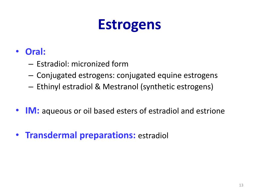 Estrogens • Oral: • Estradiol: micronized form • Conjugated estrogens: conjugated equine estrogens • Ethinyl estradiol & Mestranol (synthetic estrogens) • IM:aqueous or oil based esters of estradiol and estrione • Transdermal preparations: estradiol