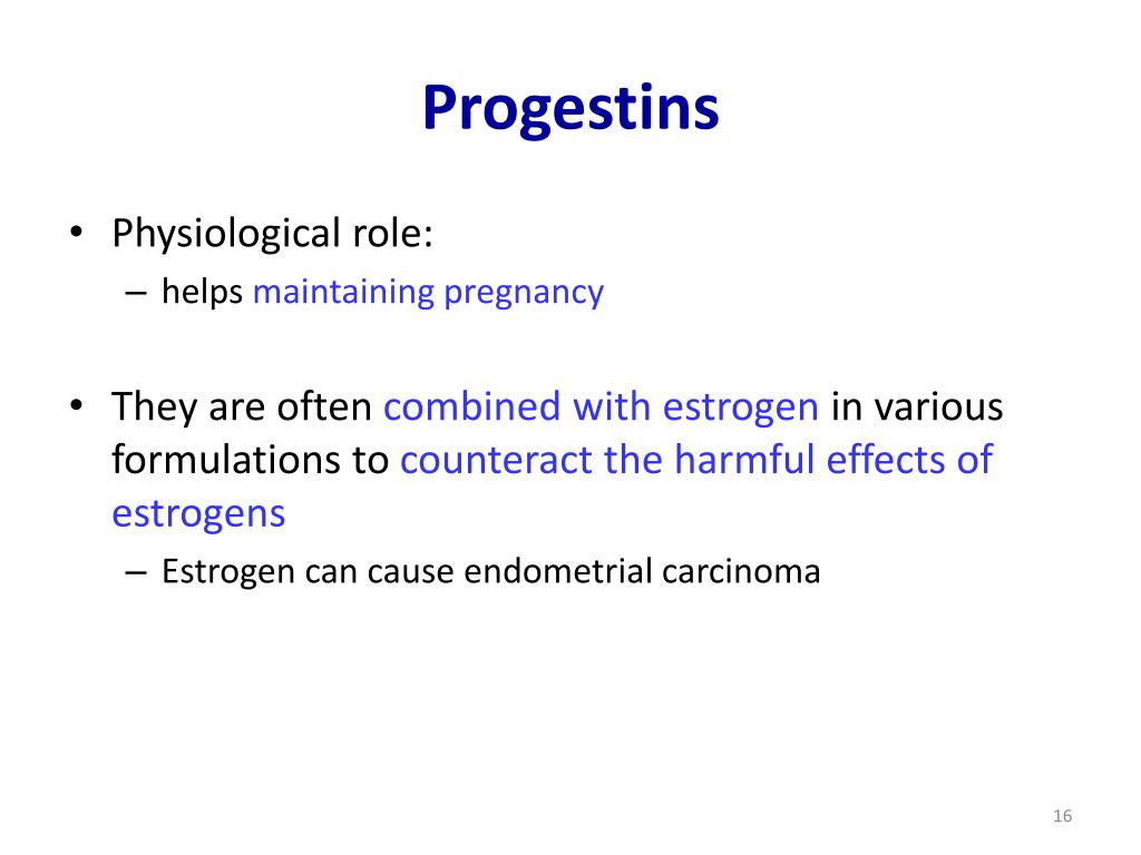 Progestins • Physiological role: • helps maintaining pregnancy • They are often combined with estrogen in various formulations to counteract the harmful effects of estrogens • Estrogen can cause endometrial carcinoma