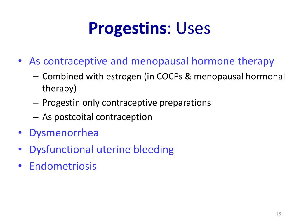 Progestins: Uses • As contraceptive and menopausal hormone therapy • Combined with estrogen (in COCPs & menopausal hormonal therapy) • Progestin only contraceptive preparations • As postcoital contraception • Dysmenorrhea • Dysfunctional uterine bleeding • Endometriosis