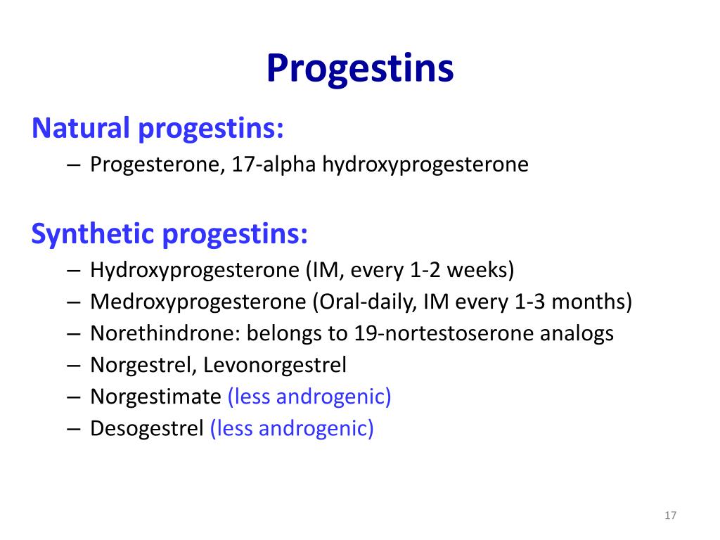 Progestins Natural progestins: • Progesterone, 17-alpha hydroxyprogesterone Synthetic progestins: • Hydroxyprogesterone (IM, every 1-2 weeks) • Medroxyprogesterone (Oral-daily, IM every 1-3 months) • Norethindrone: belongs to 19-nortestoserone analogs • Norgestrel, Levonorgestrel • Norgestimate(less androgenic) • Desogestrel(less androgenic)