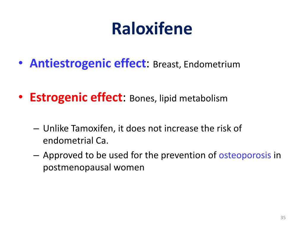 Raloxifene • Antiestrogenic effect: Breast, Endometrium • Estrogenic effect: Bones, lipid metabolism • Unlike Tamoxifen, it does not increase the risk of endometrial Ca. • Approved to be used for the prevention of osteoporosis in postmenopausal women
