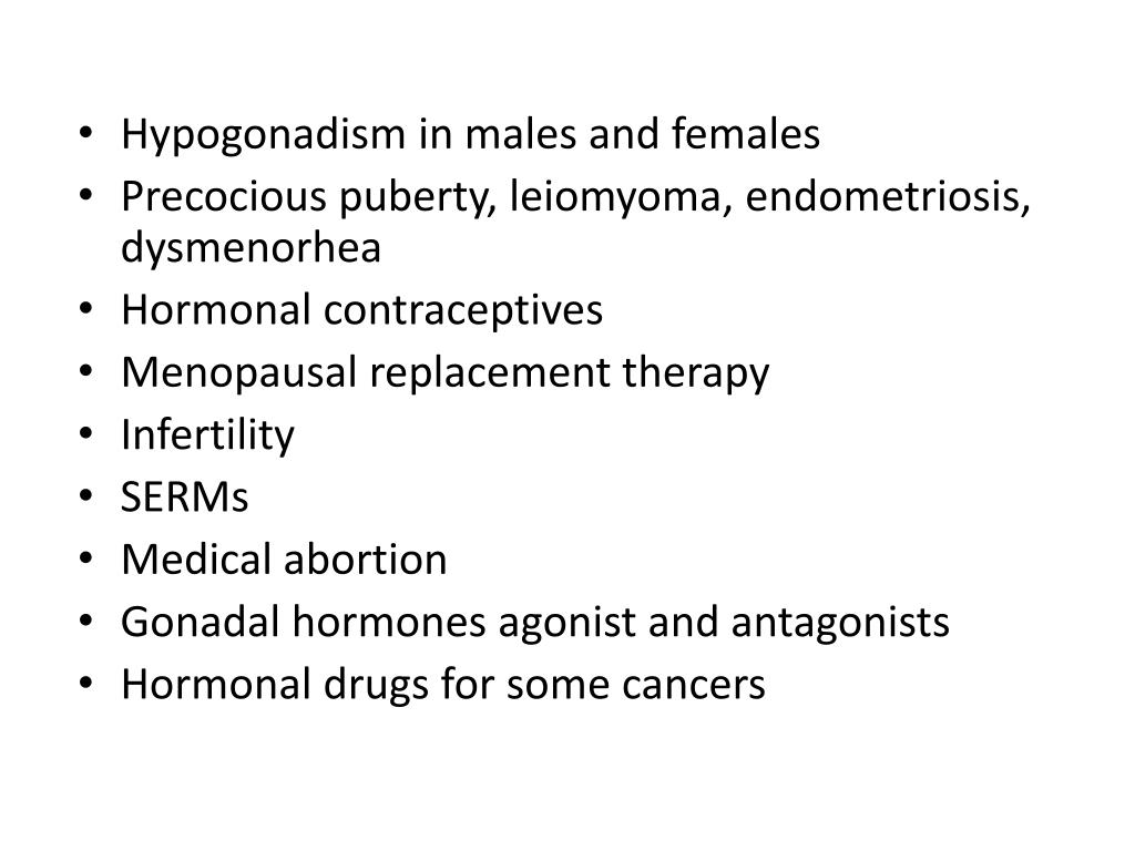 Hypogonadism in males and females • Precocious puberty, leiomyoma, endometriosis, dysmenorhea • Hormonal contraceptives • Menopausal replacement therapy • Infertility • SERMs • Medical abortion • Gonadal hormones agonist and antagonists • Hormonal drugs for some cancers
