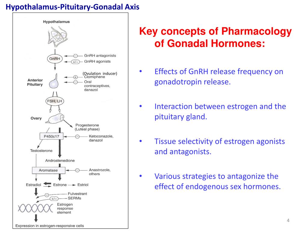 Key concepts of Pharmacology of Gonadal Hormones: Effects of GnRH release frequency on gonadotropin release. Interaction between estrogen and the pituitary gland. Tissue selectivity of estrogen agonists and antagonists. Various strategies to antagonize the effect of endogenous sex hormones. Hypothalamus-Pituitary-Gonadal Axis (Ovulation inducer)