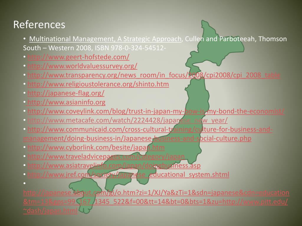 Multinational Management, A Strategic Approach, Cullen and Parboteeah, Thomson South – Western 2008, ISBN 978-0-324-54512- • http://www.geert-hofstede.com/ • http://www.worldvaluessurvey.org/ • http://www.transparency.org/news_room/in_focus/2008/cpi2008/cpi_2008_table • http://www.religioustolerance.org/shinto.htm • http://japanese-flag.org/ • http://www.asianinfo.org • http://www.coveylink.com/blog/trust-in-japan-my-bow-is-my-bond-the-economist/ • http://www.metacafe.com/watch/2224428/japanese_new_year/ • http://www.communicaid.com/cross-cultural-training/culture-for-business-and-management/doing-business-in/Japanese-business-and-social-culture.php • http://www.cyborlink.com/besite/japan.htm • http://www.traveladvicepages.com/category/japan • http://www.asiatravelinfo.com/japan/doingbusiness.asp • http://www.jref.com/society/japanese_educational_system.shtml • http://japanese.about.com/gi/o.htm?zi=1/XJ/Ya&zTi=1&sdn=japanese&cdn=education&tm=13&gps=99_167_1345_522&f=00&tt=14&bt=0&bts=1&zu=http://www.pitt.edu/~dash/japan.html References