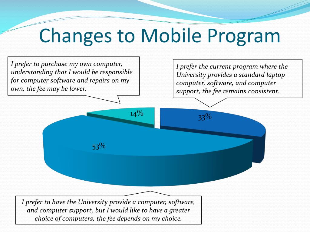 I prefer to purchase my own computer, understanding that I would be responsible for computer software and repairs on my own, the fee may be lower. Changes to Mobile Program I prefer the current program where the University provides a standard laptop computer, software, and computer support, the fee remains consistent. I prefer to have the University provide a computer, software, and computer support, but I would like to have a greater choice of computers, the fee depends on my choice.