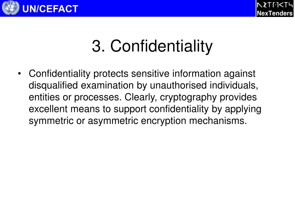 UN/CEFACT 3. Confidentiality • Confidentiality protects sensitive information against disqualified examination by unauthorised individuals, entities or processes. Clearly, cryptography provides excellent means to support confidentiality by applying symmetric or asymmetric encryption mechanisms.