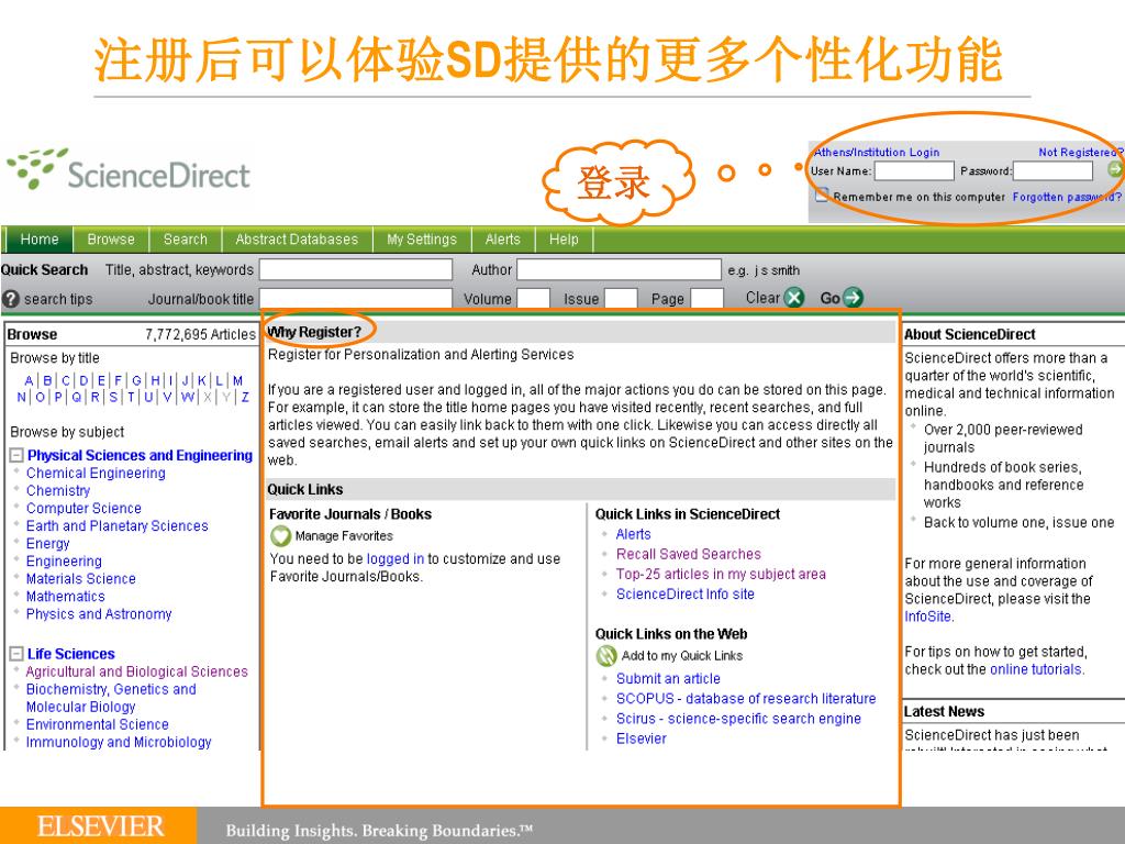 用户登录区 主页(www.sciencedirect.com) 导航栏 快速检索区 浏览区 关于SD 快速链接区