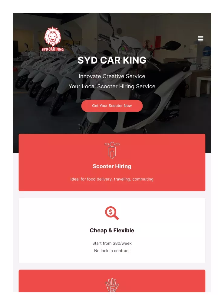 SYD CAR KING Innovate Creative Service Your Local Scooter Hiring Service Get Your Scooter Now Scooter Hiring Ideal for food delivery, traveling, commuting Cheap & Flexible Start from $80/week No lock in contract