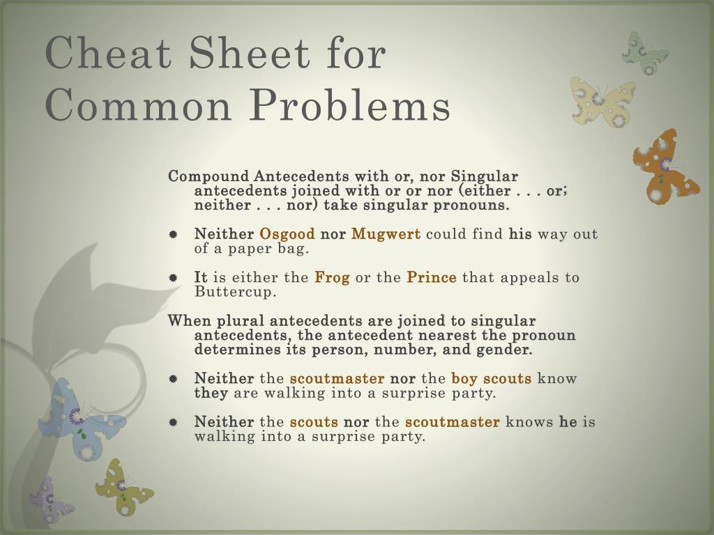 Cheat Sheet for Common Problems Compound Antecedents with or, nor Singular antecedents joined with or or nor (either . . . or; neither . . . nor) take singular pronouns. • NeitherOsgoodnorMugwert could find his way out of a paper bag. • It is either the Frog or the Prince that appeals to Buttercup. When plural antecedents are joined to singular antecedents, the antecedent nearest the pronoun determines its person, number, and gender. • Neither the scoutmasternor the boy scouts know they are walking into a surprise party. • Neither the scoutsnor the scoutmaster knows he is walking into a surprise party.