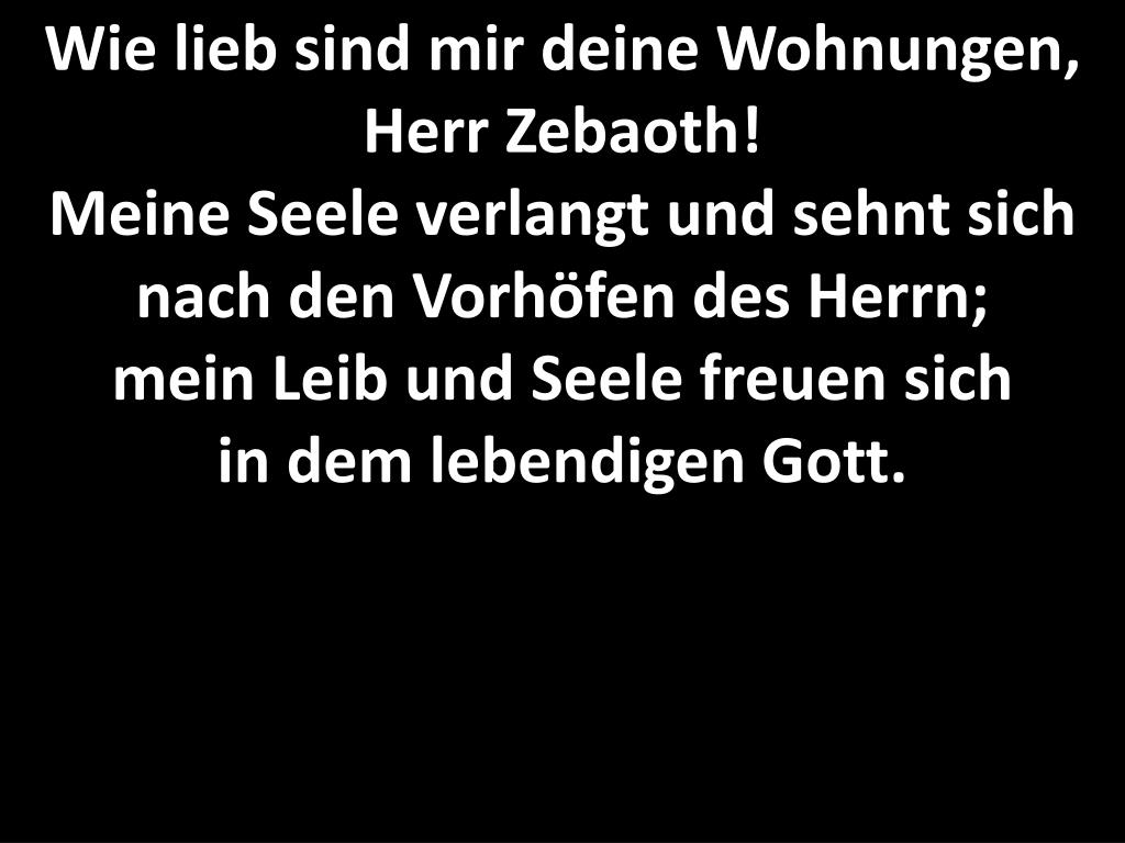 Wie lieb sind mir deine Wohnungen, Herr Zebaoth!Meine Seele verlangt und sehnt sich nach den Vorhöfen des Herrn;mein Leib und Seele freuen sichin dem lebendigen Gott.