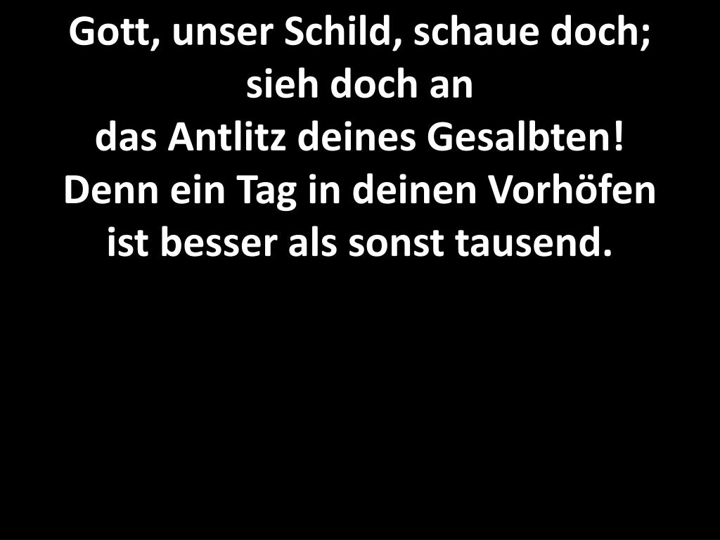 Gott, unser Schild, schaue doch;sieh doch an das Antlitz deines Gesalbten!Denn ein Tag in deinen Vorhöfenist besser als sonst tausend.