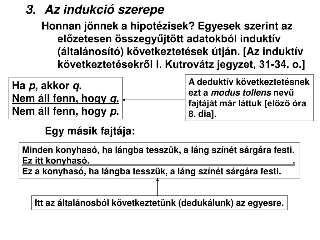 Az indukció szerepe Honnan jönnek a hipotézisek? Egyesek szerint az előzetesen összegyűjtött adatokból induktív (általánosító) következtetések útján. [Az induktív következtetésekről l. Kutrovátz jegyzet, 31-34. o.] A deduktív következtetésnek ezt a modus tollens nevű fajtáját már láttuk [előző óra 8. dia]. Ha p, akkor q. Nem áll fenn, hogy q. Nem áll fenn, hogy p. Egy másik fajtája: Minden konyhasó, ha lángba tesszük, a láng színét sárgára festi. Ez itt konyhasó. . Ez a konyhasó, ha lángba tesszük, a láng színét sárgára festi. Itt az általánosból következtetünk (dedukálunk) az egyesre.
