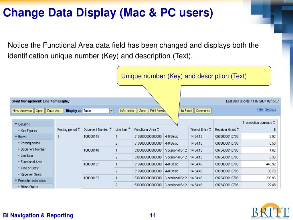 Change Data Display (Mac & PC users) Notice the Functional Area data field has been changed and displays both the identification unique number (Key) and description (Text). Unique number (Key) and description (Text)