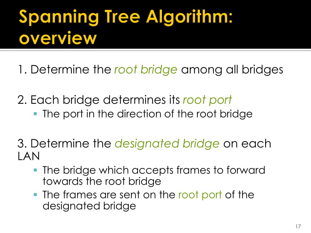 Spanning Tree Algorithm:overview 1. Determine the rootbridge among all bridges 2. Each bridge determines its root port • The port in the direction of the root bridge 3. Determine the designated bridge on each LAN • The bridge which accepts frames to forward towards the root bridge • The frames are sent on the root port of the designated bridge