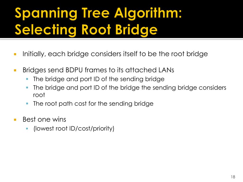 Spanning Tree Algorithm:Selecting Root Bridge • Initially, each bridge considers itself to be the root bridge • Bridges send BDPU frames to its attached LANs • The bridge and port ID of the sending bridge • The bridge and port ID of the bridge the sending bridge considers root • The root path cost for the sending bridge • Best one wins • (lowest root ID/cost/priority)