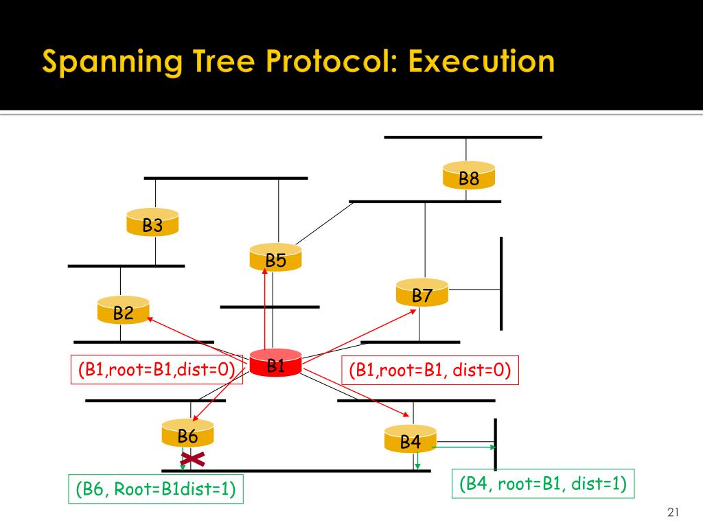 Spanning Tree Protocol: Execution B8 B3 B5 B7 B2 B1 (B1,root=B1,dist=0) (B1,root=B1, dist=0) B6 B4 (B4, root=B1, dist=1) (B6, Root=B1dist=1)