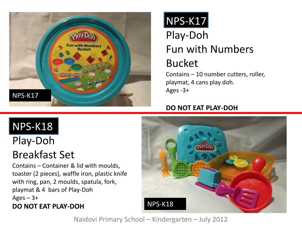 NPS-K17 Play-Doh Fun with Numbers Bucket Contains – 10 number cutters, roller, playmat, 4 cans play doh. Ages -3+ DO NOT EAT PLAY-DOH NPS-K17 NPS-K18 Play-Doh Breakfast Set Contains – Container & lid with moulds, toaster (2 pieces), waffle iron, plastic knife with ring, pan, 2 moulds, spatula, fork, playmat & 4 bars of Play-Doh Ages – 3+ DO NOT EAT PLAY-DOH NPS-K18 Naidovi Primary School – Kindergarten – July 2012