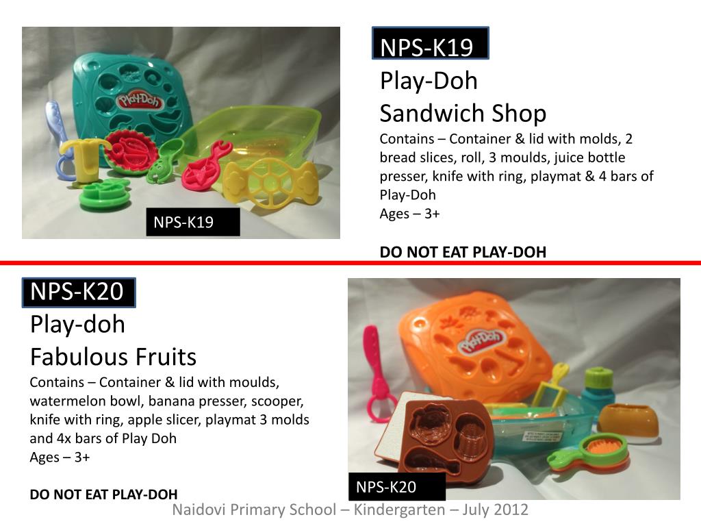 NPS-K19 Play-Doh Sandwich Shop Contains – Container & lid with molds, 2 bread slices, roll, 3 moulds, juice bottle presser, knife with ring, playmat & 4 bars of Play-Doh Ages – 3+ DO NOT EAT PLAY-DOH NPS-K19 NPS-K20 Play-doh Fabulous Fruits Contains – Container & lid with moulds, watermelon bowl, banana presser, scooper, knife with ring, apple slicer, playmat 3 molds and 4x bars of Play Doh Ages – 3+ DO NOT EAT PLAY-DOH NPS-K20 Naidovi Primary School – Kindergarten – July 2012